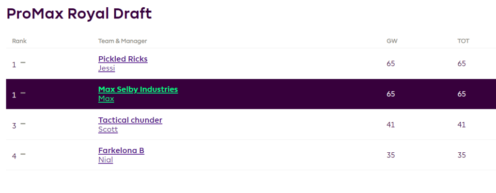 However, it’s me who’s top, and it’s my blog, so I’m now going to declare myself a genius because I (the reigning champ) am (joint) top of the ProMax Royal Draft after a thoroughly fulfilling opening weekend of Premier League action.
