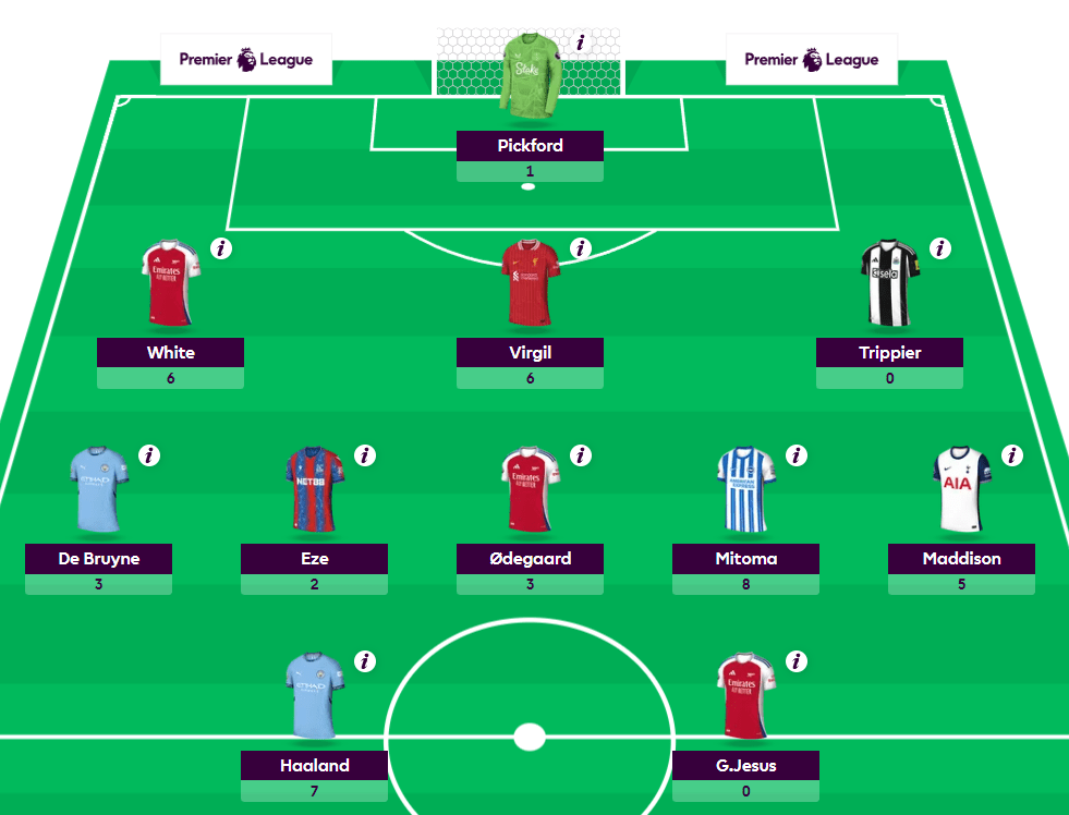 Firstly, Haaland is already proving his worth, and with Ipswich visiting the Etihad next week Scott will be salivating. You would imagine De Bruyne will start to purr soon, and when he does… ooh boy. With White, VVD, Mitoma, and Maddison all seeing returns (and Eze extremely unlucky not to be among them after a scandalously early whistle ruled out what would have been a worldie of a free kick vs Brentford) Scott can be feeling pretty good despite sitting in third.